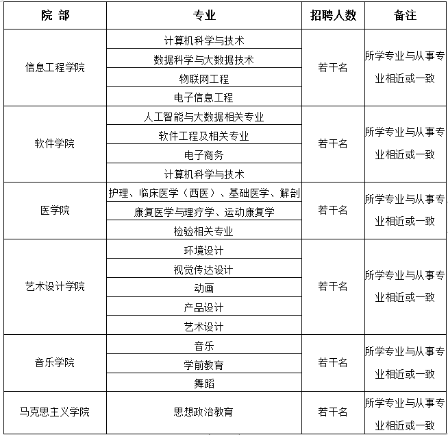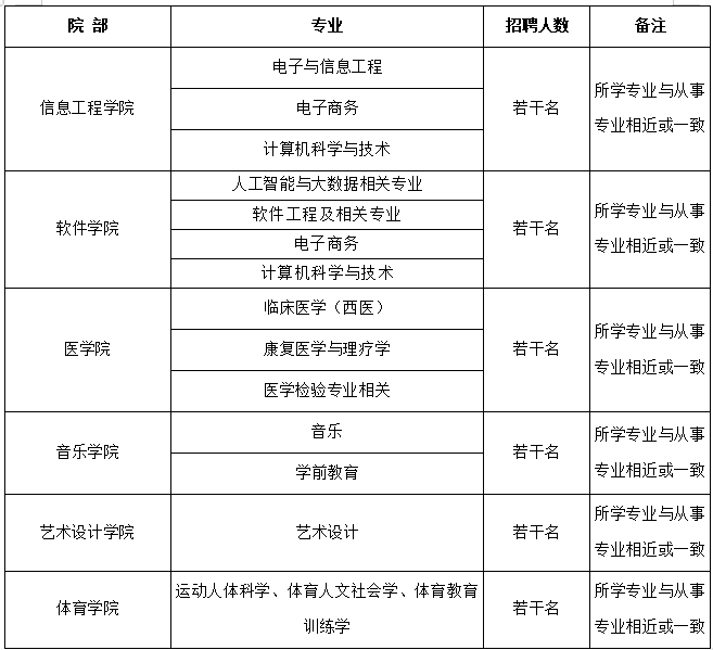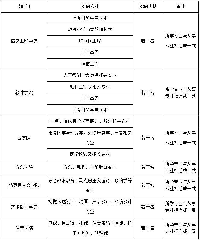 党政办公室、人事处、宣传部、团委、教学质量保障处、大数据信息管理中心等部门工作人员,985、211、双一流高校毕业生优先考虑,教育学、管理学、计算机等相关专业优先考虑,宣传部、团委工作人员应聘者必须是中共党员(中共预备党员),大数据信息管理中心多媒体技术人员应聘者须为计算相关专业。