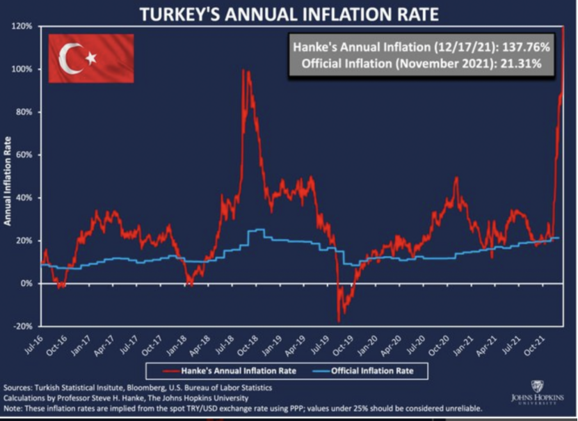 根据约翰霍普金斯大学经济学教授和诺贝尔奖获得者Steve Hanke的模型估算,该国的实际通胀率很可能已高达137%。