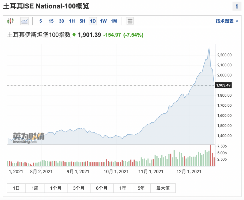 当地时间12月21日,土耳其股市开盘后,再度上演了新一轮的闪崩、暴跌,直接重挫5%,首次触发熔断,这已经是连续第三个交易日触发熔断机制。在恢复交易后,跌势仍再继续,盘中一度暴跌超7%,触发了日内的二次熔断。截至21:30,土耳其基准指数——土耳其伊斯坦堡100指数跌幅仍超7.5%,报1901.39点,相比12月17日的高点累计跌幅已高达21%。