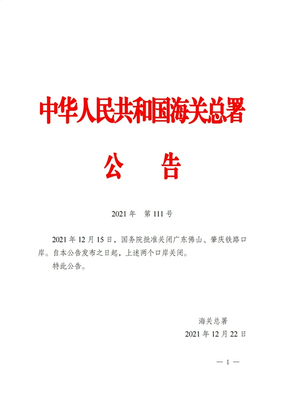 海关总署:关闭广东佛山、肇庆铁路口岸
