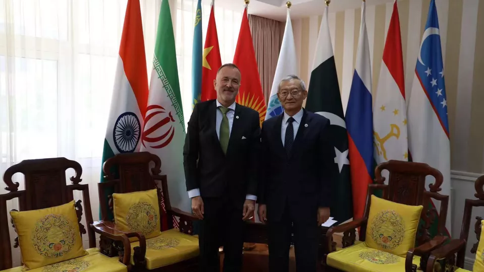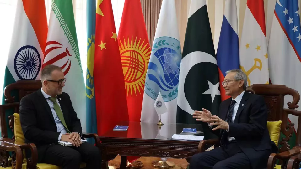 2024年4月30日,上海合作组织秘书长张明在秘书处会见新任红十字国际委员会东亚地区代表处主任史德林。
