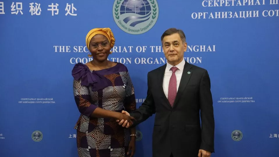 2025年10月16日,上海合作组织秘书长叶尔梅克巴耶夫在秘书处会见来访的安哥拉驻华大使艾伦。