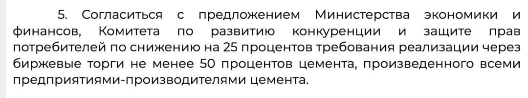 乌兹别克斯坦将下调石膏开采税,放宽水泥销售要求继降低水泥企业资源税后,乌兹别克斯坦再度出手。 自2026年起,政府将对石膏原料开采实行减半征税,并允许水泥厂减少通过交易所销售的比例,释放更多市场自主空间。 新闻快讯 NEWS 据2025年10月31日spot.uz报道,自2026年起,乌兹别克斯坦计划对建筑行业企业实行一系列税收和行政优惠政策。这些措施写入了乌兹别克斯坦总统10月4日签署的相关法令中。 *相关总统令: https://lex.uz/uz/docs/7762303 自2026年1月1日至2028年1月1日期间,那些为了自身需求开采石膏原料并将其用于生产建筑成品材料的企业,将可按规定税率的50%缴纳矿产资源使用税。 目前,生石膏、熟石膏、无水石膏和建筑石膏的矿产税率为5%,但不得低于每立方米15,950苏姆(约合人民币9.4元)。 文件同时批准了经济与财政部、竞争与消费者权益保护委员会关于降低水泥通过交易所销售比例的提案。 原先要求通过交易所销售不少于生产量50%的规定,将下调25%。 △ 总统令的原文截图 这意味着,水泥企业只需在交易所出售37.5%的产量,其余可通过直接合同方式销售。 据spot.uz回顾,自2024年起,乌兹别克斯坦就计划将水泥生产企业的矿产资源税从原计划减半,实际削减至原来的四分之一。 此举被称为“经济刺激措施”,但其对生态环境与公众健康的影响却鲜有讨论。 凭借这项优惠政策,水泥企业共节省了约2500亿苏姆(约合人民币1.48亿元)。 自今年年初以来,商品原料交易所上的水泥价格上涨了近25%。截至10月20日,从每吨511,800苏姆(约合人民币303元)涨至637,900苏姆(约合人民币377元)。 作为参考,2024年10月21日时,水泥在交易所的价格为每吨527,000苏姆(约合人民币312元)。 相关事件: 限制从哈萨克斯坦进口水泥 spot.uz回顾,此前,哈萨克斯坦水泥与混凝土生产商协会(QazCem)主席叶尔博尔·阿克姆巴耶夫(Ербол Акымбаев)表示,乌兹别克斯坦已限制从哈萨克斯坦进口价格低于每吨300美元的水泥,尽管产品实际成本仅为每吨30美元。 此举导致哈萨克斯坦对乌兹别克斯坦的水泥出口在七年来首次降至零。 |
