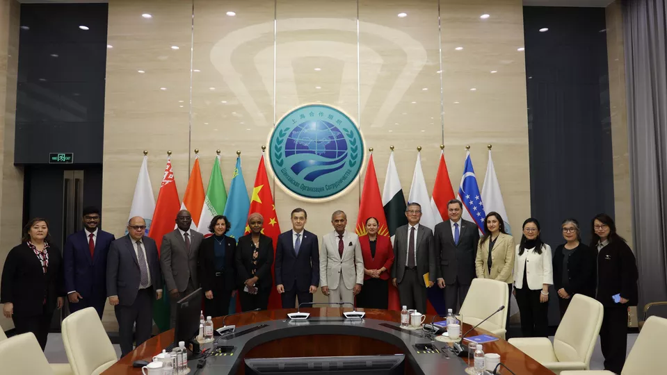2025年11月14日,上海合作组织秘书长叶尔梅克巴耶夫在秘书处会见来访的联合国驻华协调员常启德。联合国多个专门机构的驻华负责人亦参加会见。